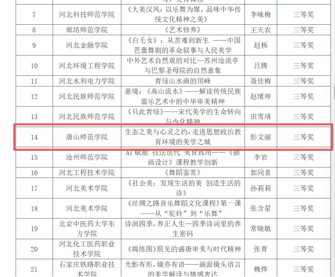 近日,河北省教育厅公布2025年高校美育教师教学能力大赛评选结果,bv伟德国际1946教师彭文丽的授课作品《生态之美与心灵之约:走进思想政治教育环境的美学之城》获得三等奖。这一成绩不仅是教师的个人荣誉,更折射出当前美育与思想政治教育深度融合的创新趋势。