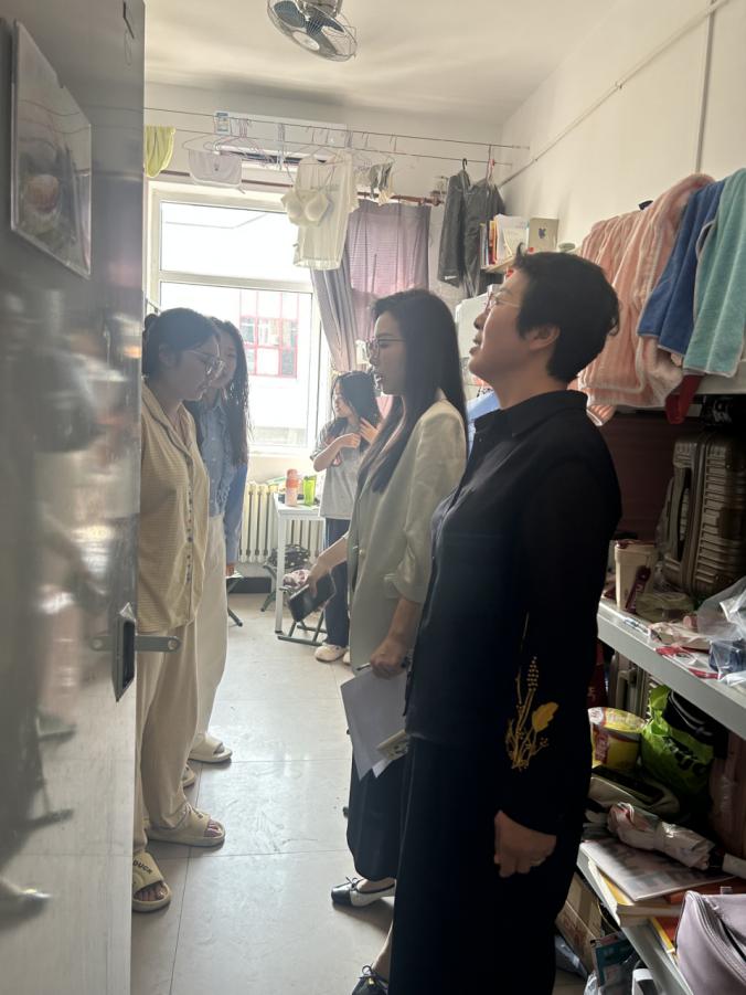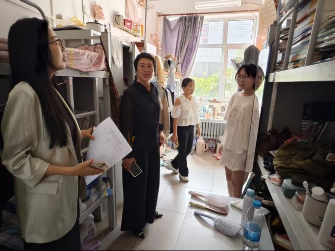 为确保国庆假期安全,加强学生宿舍安全管理,营造安全、整洁、和谐的生活氛围,2025年9月30日上午,bv伟德国际1946党总支副书记董怀晶、学工办主任齐艳梅,团总支书记李思思深入bv伟德国际1946学生宿舍开展了安全检查并探望留校学生。